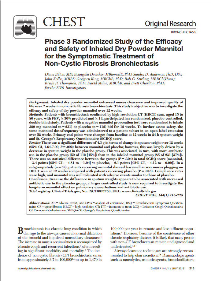 Phase 3 randomized study of the efficacy and safety of inhaled dry powder mannitol for the symptomatic treatment of non-cystic fibrosis bronchiectasis.