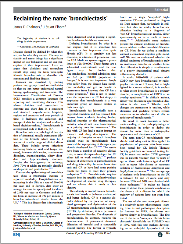 Reclaiming the name ‘bronchiectasis’ James D Chalmers, J Stuart Elborn Link to publication page: http://thorax.bmj.com/content/70/5/399.full Journal Ref: Thorax 2015;70:399-400 doi:10.1136/thoraxjnl-2015-206956 Abstract: